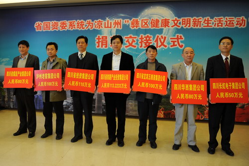 4月8日,省國資委系統(tǒng)舉行了為涼山州“彝區(qū)健康文明新生活運(yùn)動(dòng)”捐款儀式,省委常委、省人大常委會(huì)副主任、省國資委黨委書記王少雄,省人大常委會(huì)副主任、省國資委主任彭渝,省政府副省長張作哈出席捐款儀式,省國資委系統(tǒng)69家企業(yè)共捐款1044萬元。