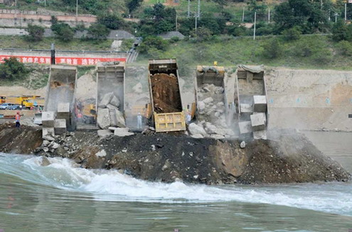 中共攀枝花市委副書(shū)記、市長(zhǎng)張剡,攀枝花市政協(xié)主席高方芹,攀枝花市委副書(shū)記趙輝,川投集團(tuán)副總經(jīng)理伍康定,國(guó)投華靖電力基建管理部經(jīng)理劉明勝,攀枝花市相關(guān)部門、鹽邊和米易縣委、縣政府以及電站建設(shè)、監(jiān)理、設(shè)計(jì)、施工等單位的領(lǐng)導(dǎo)、建設(shè)者代表共400余人一同見(jiàn)證了截流盛況。伍康定副總經(jīng)理代表川投集團(tuán)致辭。11時(shí)10分,張剡宣布雅礱江桐子林水電站工程大江截流龍口合龍開(kāi)始,一輛輛滿載著大塊石的大型自卸車一字排開(kāi),大量拋填料被拋入江中。11時(shí)40分,龍口勝利實(shí)現(xiàn)合龍,這是二灘公司第五次成功截?cái)嘌诺a江,讓江河改道。