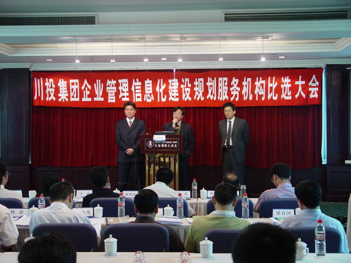 按照川投集團信息化工作要求和工作進度安排,2006年5月17日,川投集團管理信息化建設(shè)規(guī)劃服務(wù)機構(gòu)比選大會在龍泉天倫國際大酒店召開,集團公司總經(jīng)理郭勇、黨委副書記、紀委書記龔明銳、總經(jīng)理助理李文志、集團公司計劃部薛東兵、審計部鄭世紅、黨群部楊強、王軍、法律部徐建華等相關(guān)部門負責人及評審專家參加了會議,省國資委副主任張明泉及企業(yè)改革處王霞同志也應(yīng)邀參加了會議。