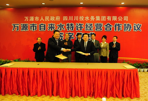 簽字儀式上,集團公司副總經(jīng)理、川投水務集團董事長李文志與中共萬源市委副書記、市人民政府市長吳曉勇簽訂了《萬源市城區(qū)自來水特許經(jīng)營合作協(xié)議》;川投水務集團總經(jīng)理梁有國與萬源市國資辦主任陳守英簽訂了《民生供排水公司國有產(chǎn)權(quán)和特許經(jīng)營權(quán)轉(zhuǎn)讓協(xié)議》。根據(jù)兩個協(xié)議,川投水務集團收購民生公司全部產(chǎn)權(quán)和萬源市城區(qū)30年自來水特許經(jīng)營權(quán),并投資建成馱山水廠,有效解決萬源市城區(qū)市民用水困難的問題。兩個協(xié)議的簽訂,標志著川投水務集團在項目拓展、壯大規(guī)模方面取得新的進展。
