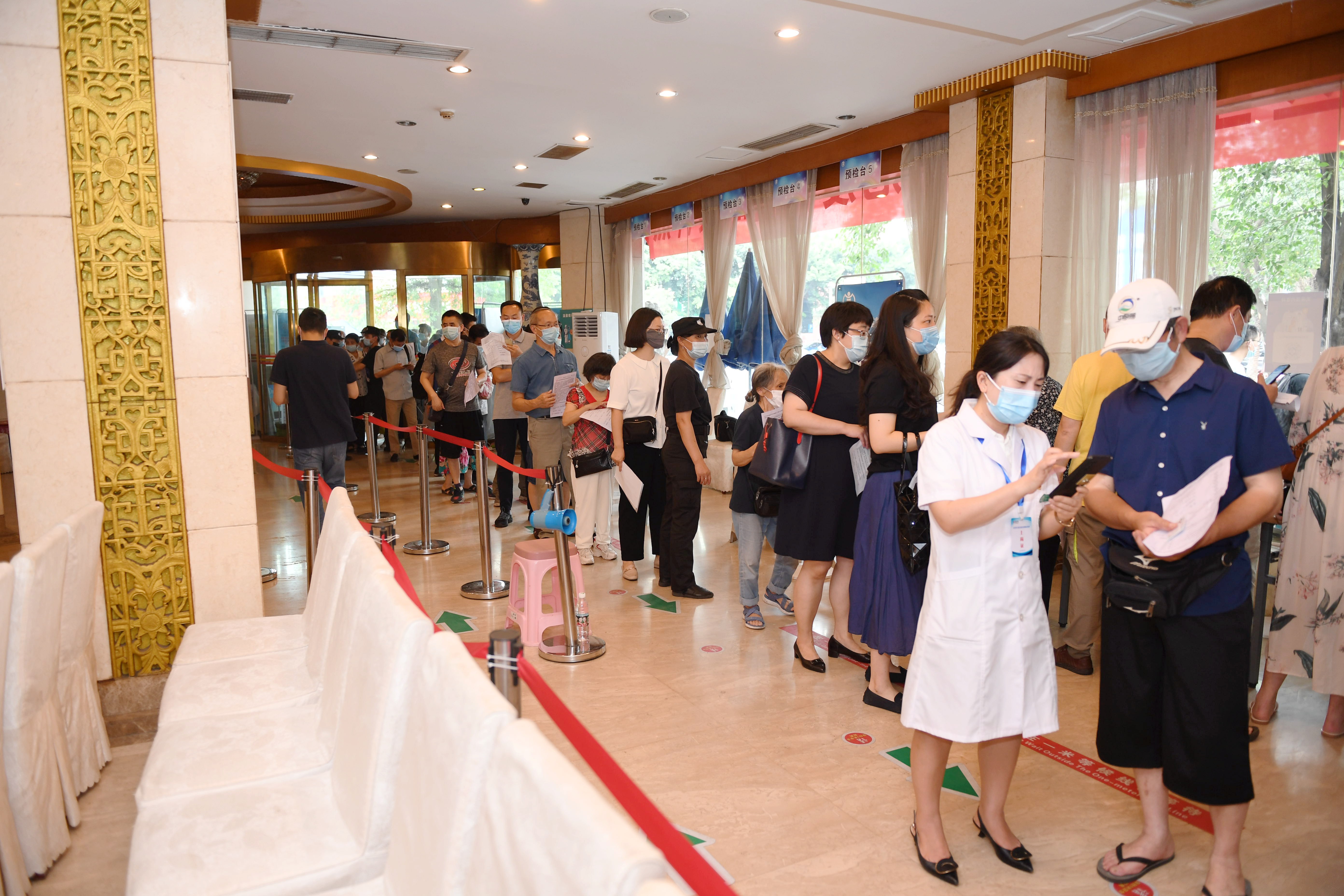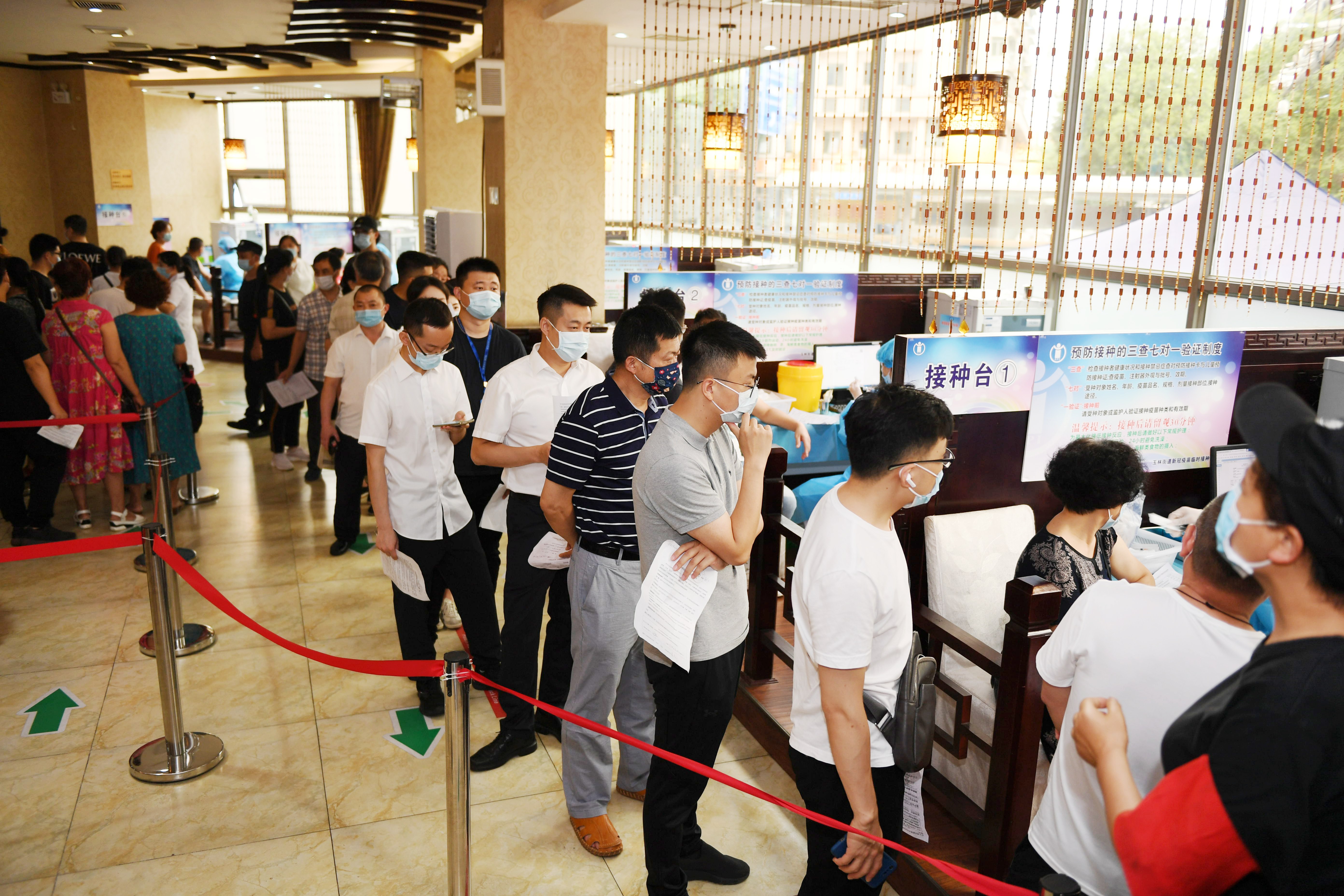 在接種現場,前來接種的干部職工佩戴口罩有序排隊,主動接受現場醫(yī)護人員的體溫檢測和健康問詢,在填寫相關表格登記后有序進行疫苗注射。