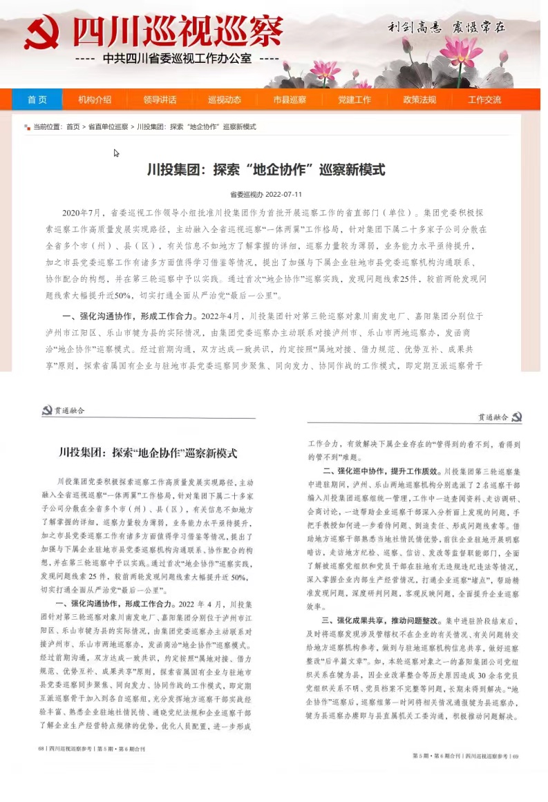 四川省紀(jì)委監(jiān)委內(nèi)網(wǎng)、《四川巡視巡察參考》刊載刊發(fā)川投集團(tuán)探索創(chuàng)新“地企協(xié)作”巡察工作有關(guān)信息