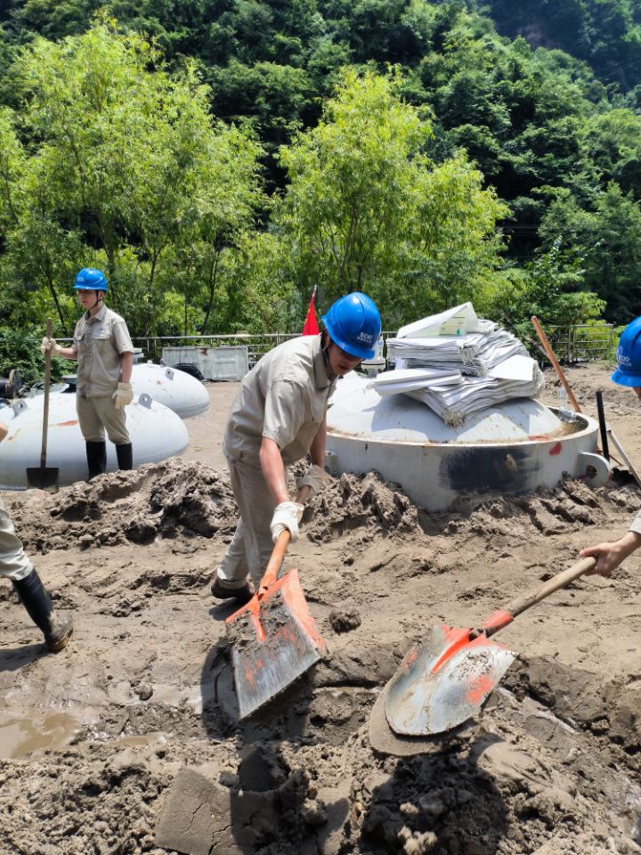 “戰(zhàn)疫保電”的同時,田灣河公司還經(jīng)歷了一次抗險救災(zāi)考驗。8月底,一場大雨裹挾著2萬余方泥石流沖毀了田灣河生產(chǎn)現(xiàn)場通往仁宗海電站的道路與主要線路。為確保安全發(fā)電,基地所有部門悉數(shù)出動,“白 黑”連續(xù)奮戰(zhàn)搶險自救。泥濘的滑坡體里,黨員沖鋒在前排查隱患;傾倒的電線桿旁,青年志愿者逐一排查受損情況;被泥水淹沒的庫房里,黨員突擊隊全力清淤;廠房里、大壩旁,身處交通孤島的黨員職工們沉著冷靜堅持工作。