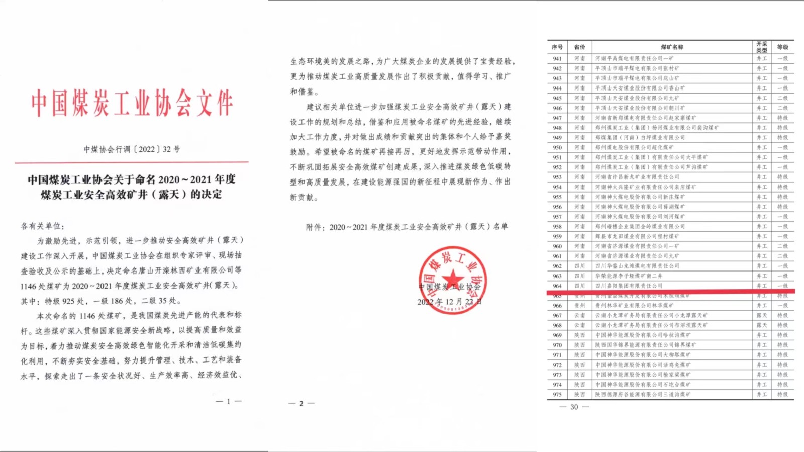 12月22日,根據(jù)《中國煤炭工業(yè)協(xié)會(huì)關(guān)于命名2020-2021年度煤炭工業(yè)安全高效礦井(露天)的決定》(中煤協(xié)會(huì)行調(diào)〔2022〕32號(hào))文件,嘉陽集團(tuán)嘉陽煤礦從全國一千一百多家煤礦企業(yè)中脫穎而出,被命名為全國煤炭工業(yè)安全高效一級(jí)礦井(露天),蟬聯(lián)這一殊榮。