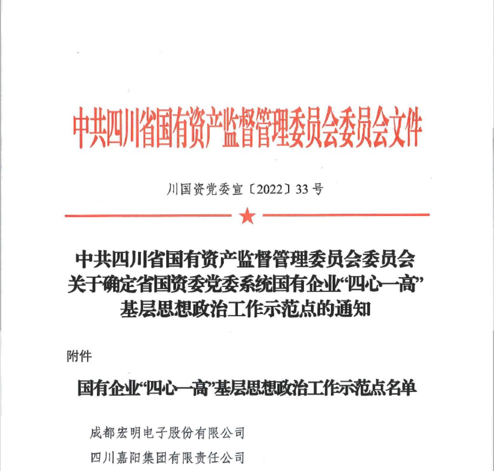 近日,中共四川省國有資產(chǎn)監(jiān)督管理委員會委員會發(fā)布《關(guān)于確定省國資委黨委系統(tǒng)國有企業(yè)“四心一高”基層思想政治工作示范點(diǎn)的通知》,川投集團(tuán)所屬成都宏明電子股份有限公司、四川嘉陽集團(tuán)有限責(zé)任公司兩家單位榜上有名,成功躋身示范點(diǎn)。