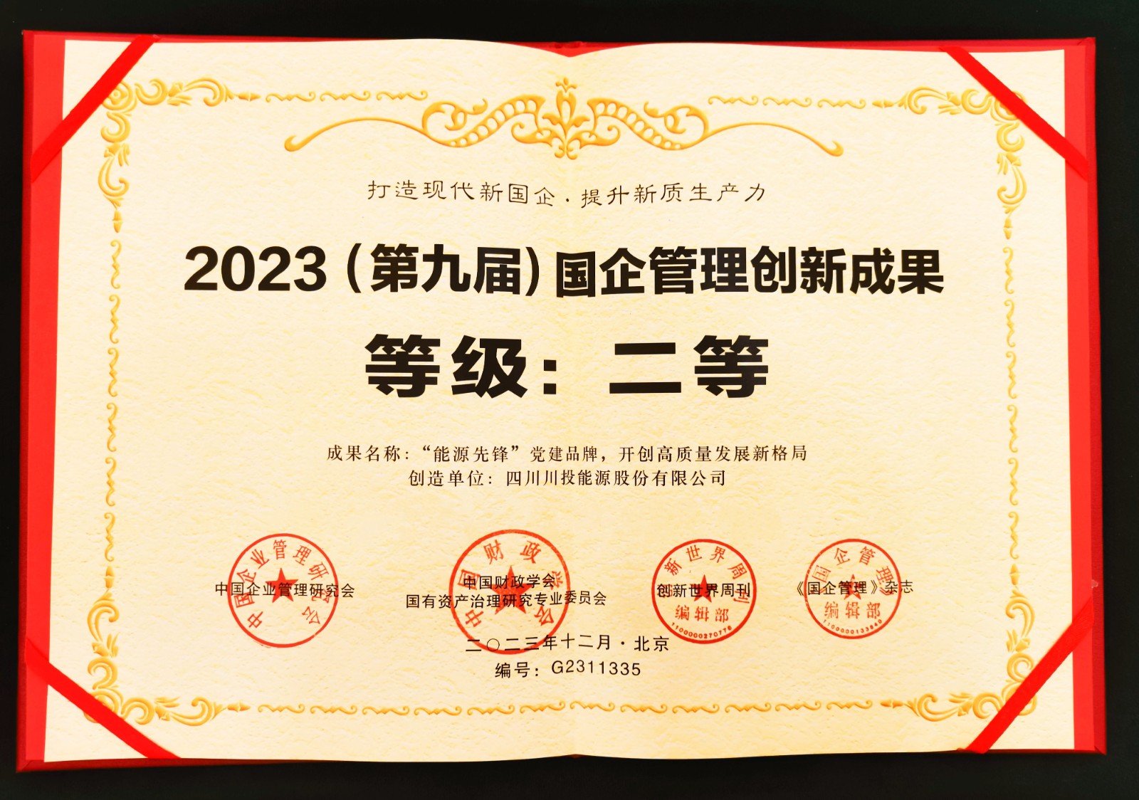 近日,2023(第九屆)國企管理年會暨國企管理創(chuàng)新成果發(fā)布儀式在北京國際會議中心隆重召開。川投能源黨委《“能源先鋒”黨建品牌,開創(chuàng)高質(zhì)量發(fā)展新格局》黨建創(chuàng)新成果(案例)獲評二等獎,并入選《國企管理創(chuàng)新成果年度報告》。