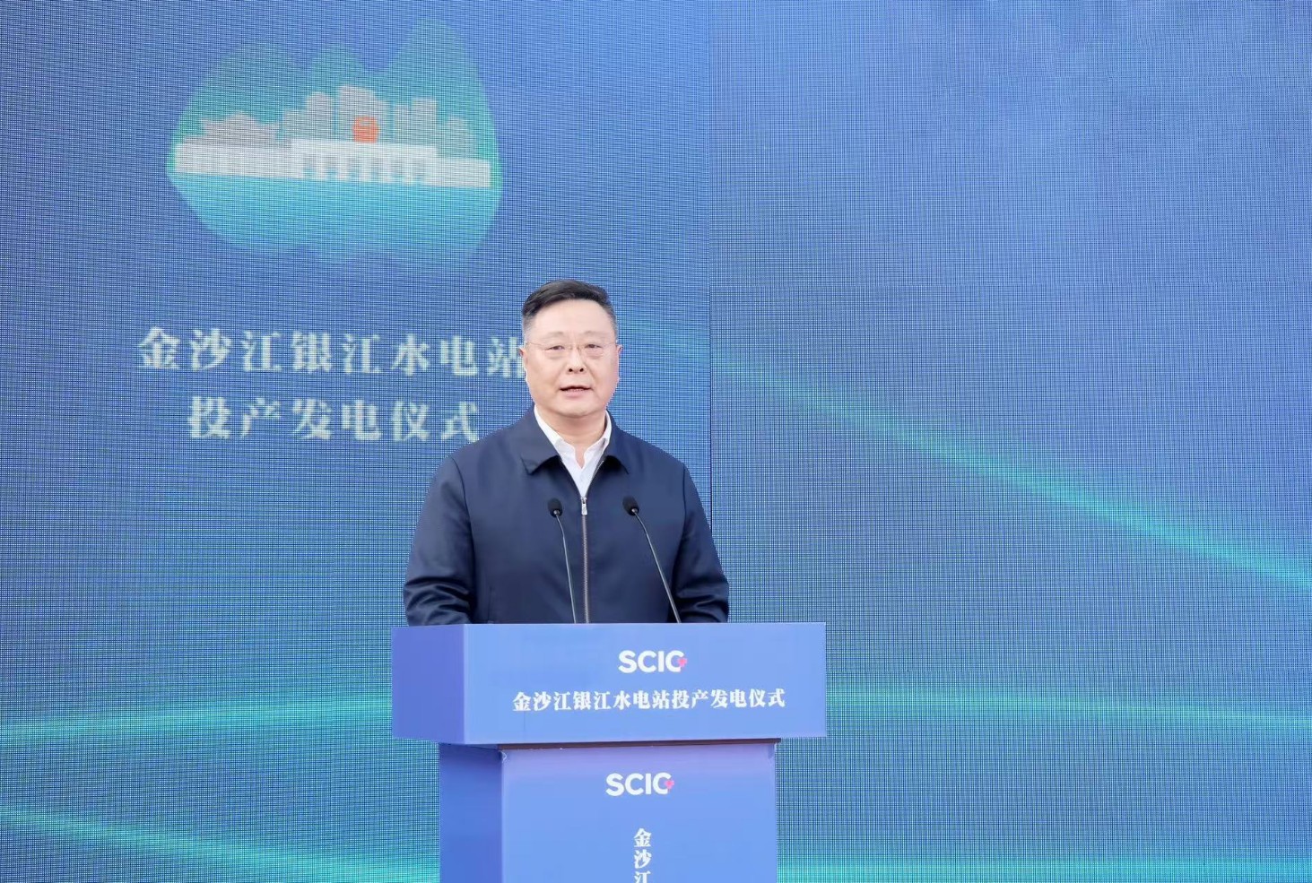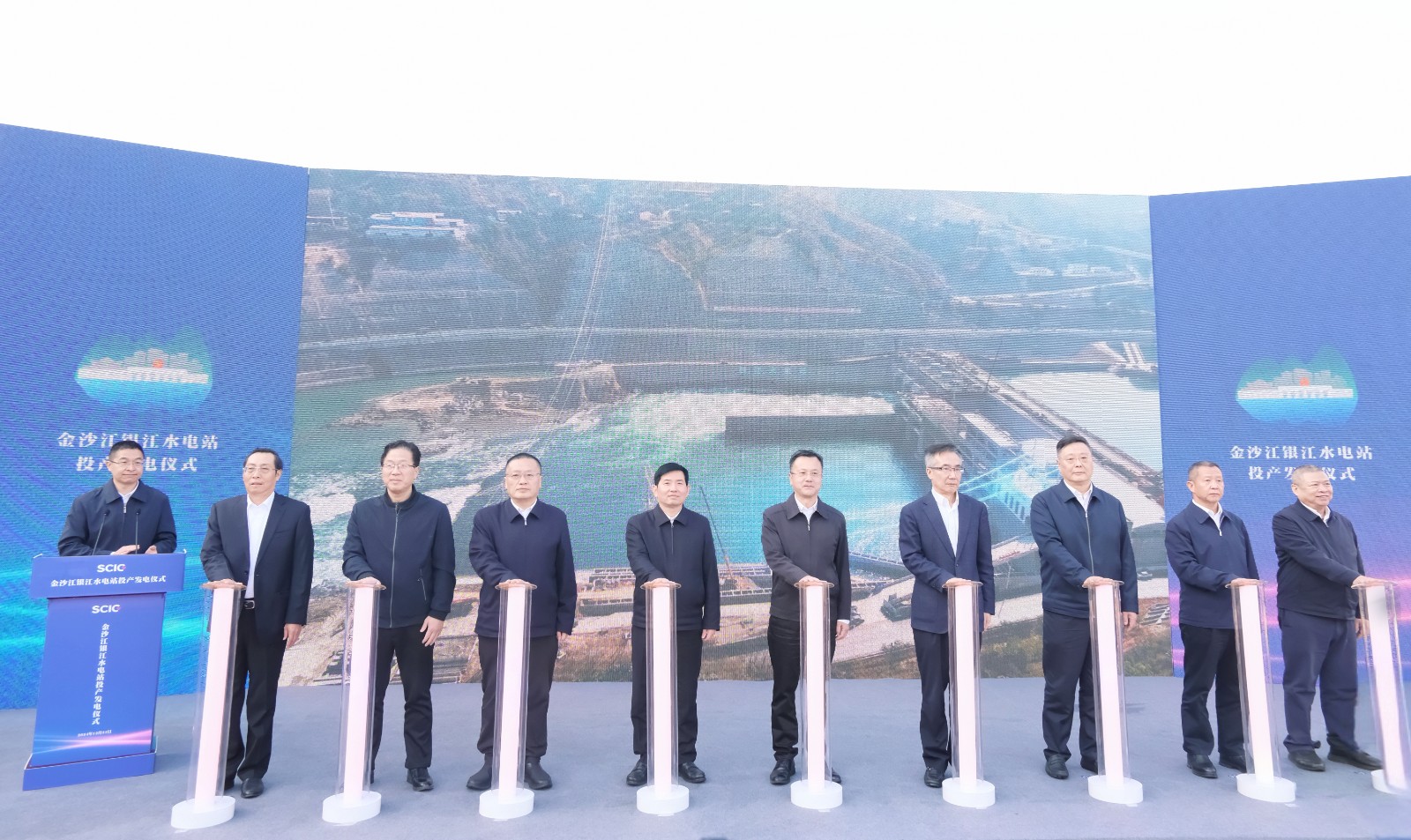 上午9時許,隨著儀式現場下達首臺機組開機發(fā)電指令,吳群剛、吳曉曦、范繼躍、李文志、林建國、李仁杰等領導按下啟動柱,共同啟動金沙江銀江水電站投產發(fā)電。