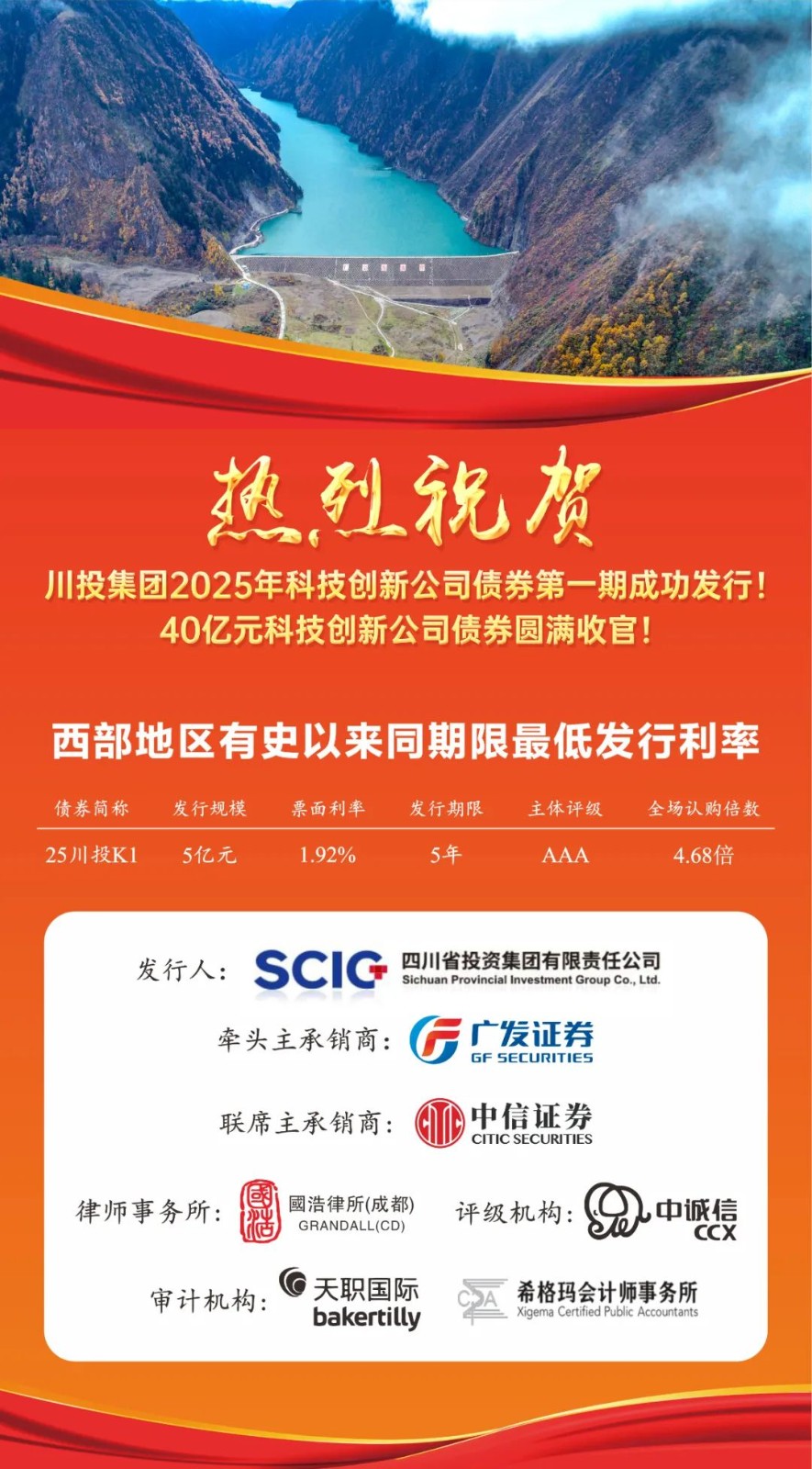 1月9日,川投集團在深圳證券交易所成功發(fā)行2025年面向專業(yè)投資者公開發(fā)行科技創(chuàng)新公司債券(第一期),發(fā)行規(guī)模5億元,期限5年,發(fā)行票面利率1.92%,為西部地區(qū)有史以來同期限最低利率。