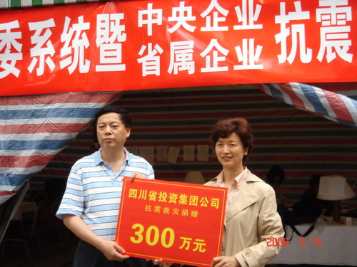 2008年5月15日上午9:30分,川投集團積極響應(yīng)省國資委關(guān)于開展抗震救災(zāi)捐贈活動的號召,發(fā)揚“一方有難,八方支援”的精神,認真履行社會責任,在接到通知后快速行動起來,由總會計師曹筱萍帶隊,在省國資委抗震救災(zāi)指揮部內(nèi),向四川省慈善總會無私捐出人民幣300萬元,代表16000名川投人的無私愛心,將有力支援災(zāi)區(qū)人民重建家園。(川投集團抗震救災(zāi)領(lǐng)導小組辦公室整理)