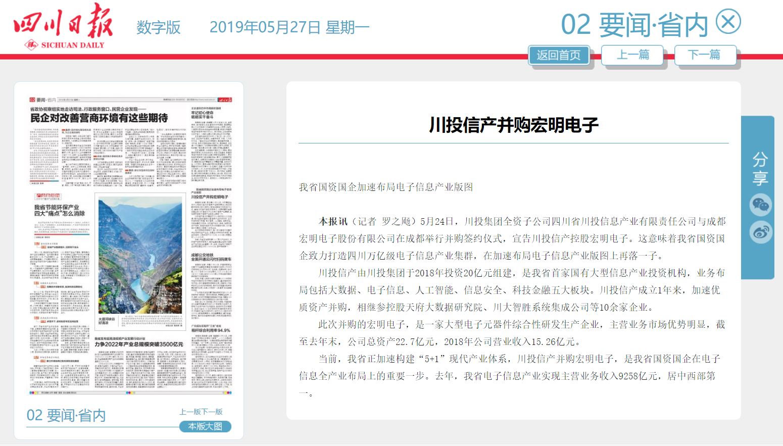 本報訊(記者 羅之飏)5月24日,川投集團全資子公司四川省川投信息產(chǎn)業(yè)有限責任公司與成都宏明電子股份有限公司在成都舉行并購簽約儀式,宣告川投信產(chǎn)控股宏明電子。這意味著我省國資國企致力打造四川萬億級電子信息產(chǎn)業(yè)集群,在加速布局電子信息產(chǎn)業(yè)版圖上再落一子。