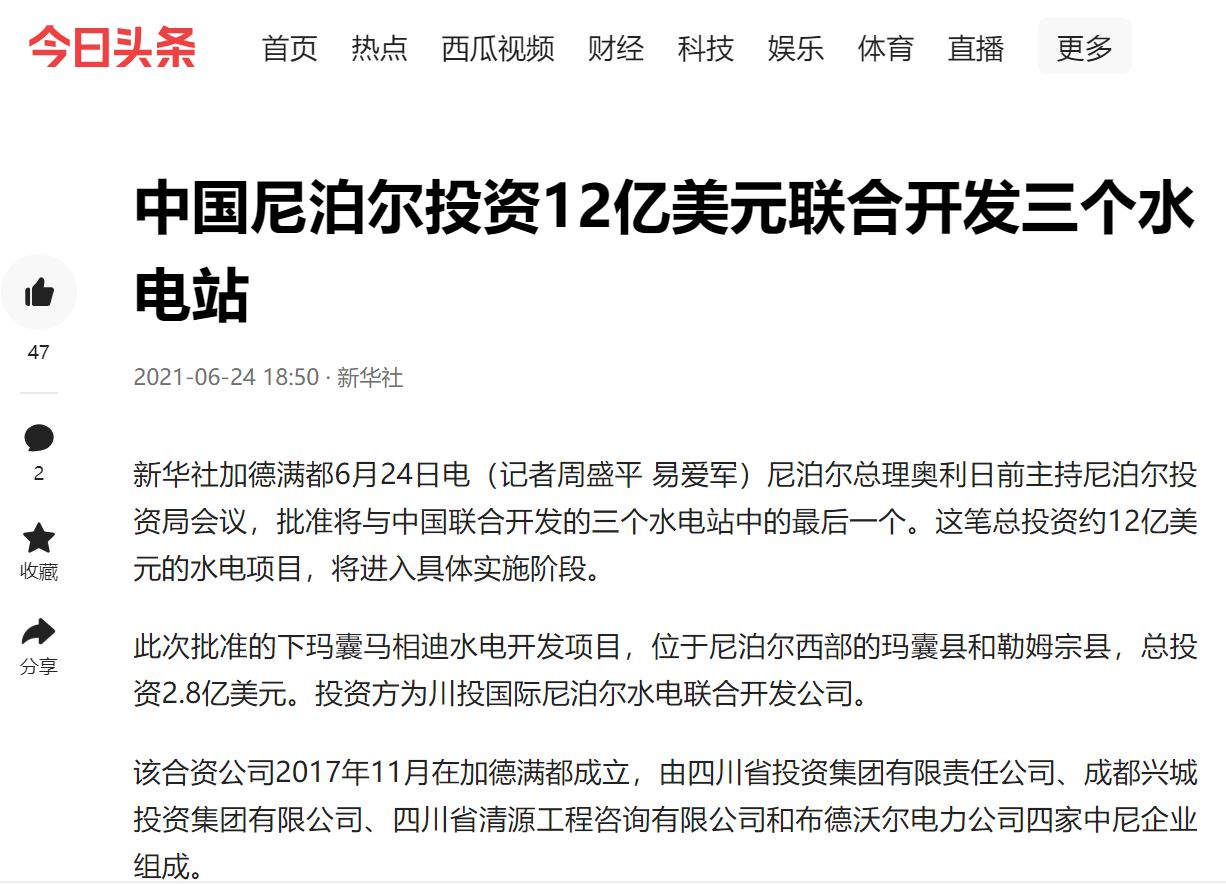 此次批準的下瑪囊馬相迪水電開發(fā)項目,位于尼泊爾西部的瑪囊縣和勒姆宗縣,總投資2.8億美元。投資方為川投國際尼泊爾水電聯(lián)合開發(fā)公司。
