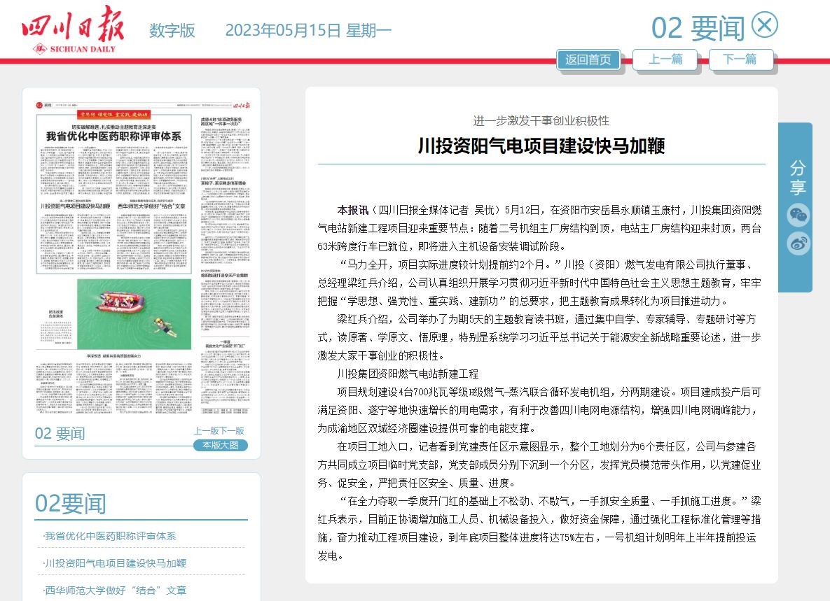 本報訊(四川日報全媒體記者 吳憂)5月12日,在資陽市安岳縣永順鎮(zhèn)玉康村,川投集團資陽燃氣電站新建工程項目迎來重要節(jié)點:隨著二號機組主廠房結構到頂,電站主廠房結構迎來封頂,兩臺63米跨度行車已就位,即將進入主機設備安裝調試階段。