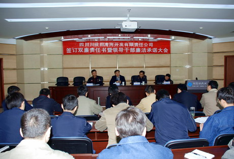 會(huì)上,孫志祥代表經(jīng)營(yíng)班子成員向全體員工進(jìn)行了廉潔承諾,同時(shí)代表公司與各部門負(fù)責(zé)人簽訂了《廉潔經(jīng)營(yíng)、廉政建設(shè)責(zé)任書》。公司副總工程師、大發(fā)項(xiàng)目管理部經(jīng)理何廷剛代表公司部門負(fù)責(zé)人向全體員工進(jìn)行了廉潔承諾。經(jīng)營(yíng)班子成員和各部門負(fù)責(zé)人都鄭重地在廉潔承諾書上簽了字。