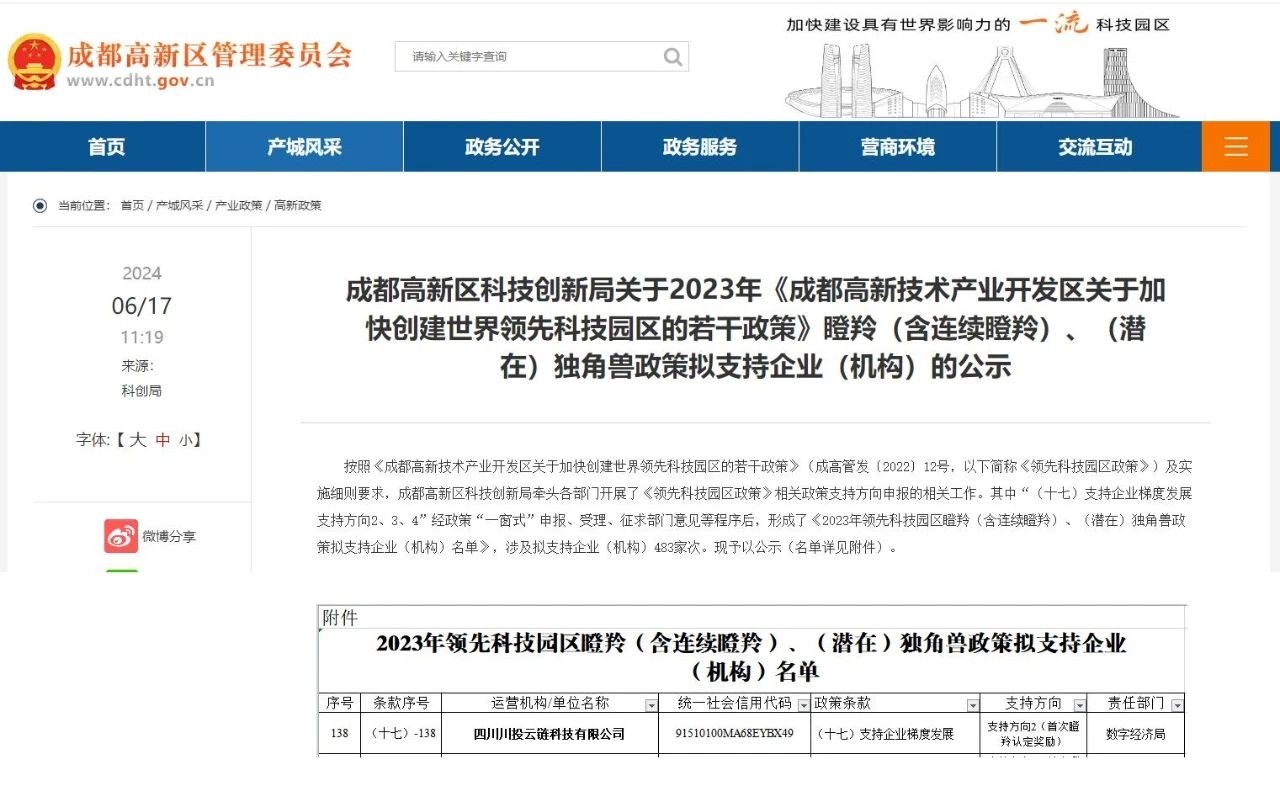 近日,成都高新區(qū)科技創(chuàng)新局公布了2023年《成都高新技術(shù)產(chǎn)業(yè)開發(fā)區(qū)關(guān)于加快創(chuàng)建世界領(lǐng)先科技園區(qū)的若干政策》瞪羚、獨角獸政策擬支持企業(yè)名單,川投信產(chǎn)所屬川投云鏈入選“瞪羚企業(yè)”,公司科技創(chuàng)新、市場表現(xiàn)、發(fā)展實力再獲權(quán)威認可。