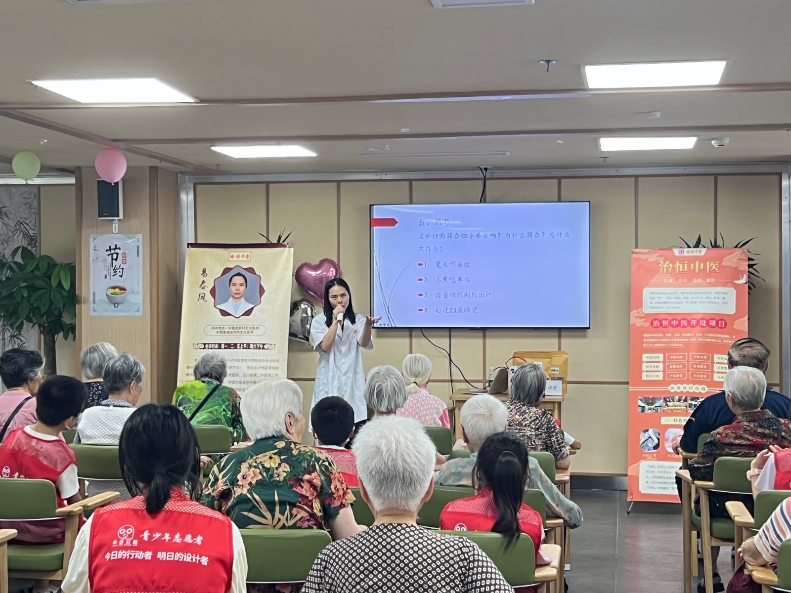 武侯青年志愿者們與治恒中醫(yī)館的中醫(yī)老師以“三伏天健康知識小講堂”的特色形式,為院內(nèi)在住長者講授了夏日防暑降溫常識及注意事項(xiàng)。針對長者夏季易發(fā)、常見疾病,中醫(yī)老師們也進(jìn)行了針對性防護(hù)防范措施講解及演示,讓廣大長者了解掌握了炎夏如何進(jìn)行“科學(xué)避暑、有效降溫”。