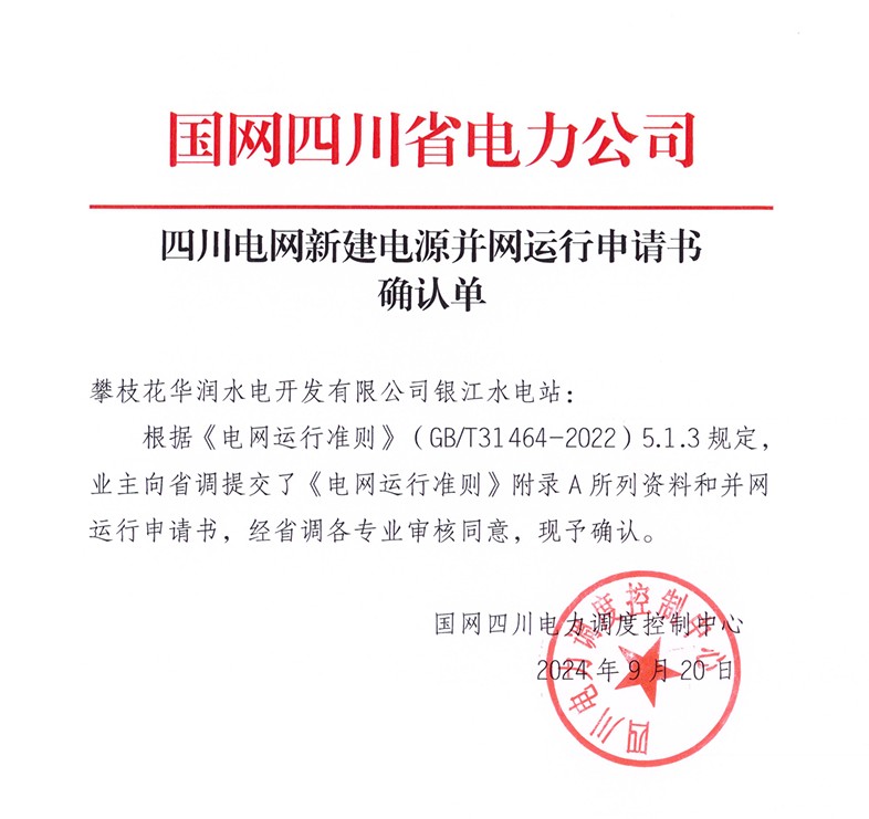9月20日,在國網(wǎng)四川省電力公司和川投能源的指導(dǎo)幫助下,經(jīng)過積極對接、多方協(xié)調(diào),川投能源下屬攀水電公司成功取得銀江水電站新建電源并網(wǎng)運行申請書確認(rèn)單,標(biāo)志著銀江水電站具備并網(wǎng)手續(xù)辦理的資格條件。