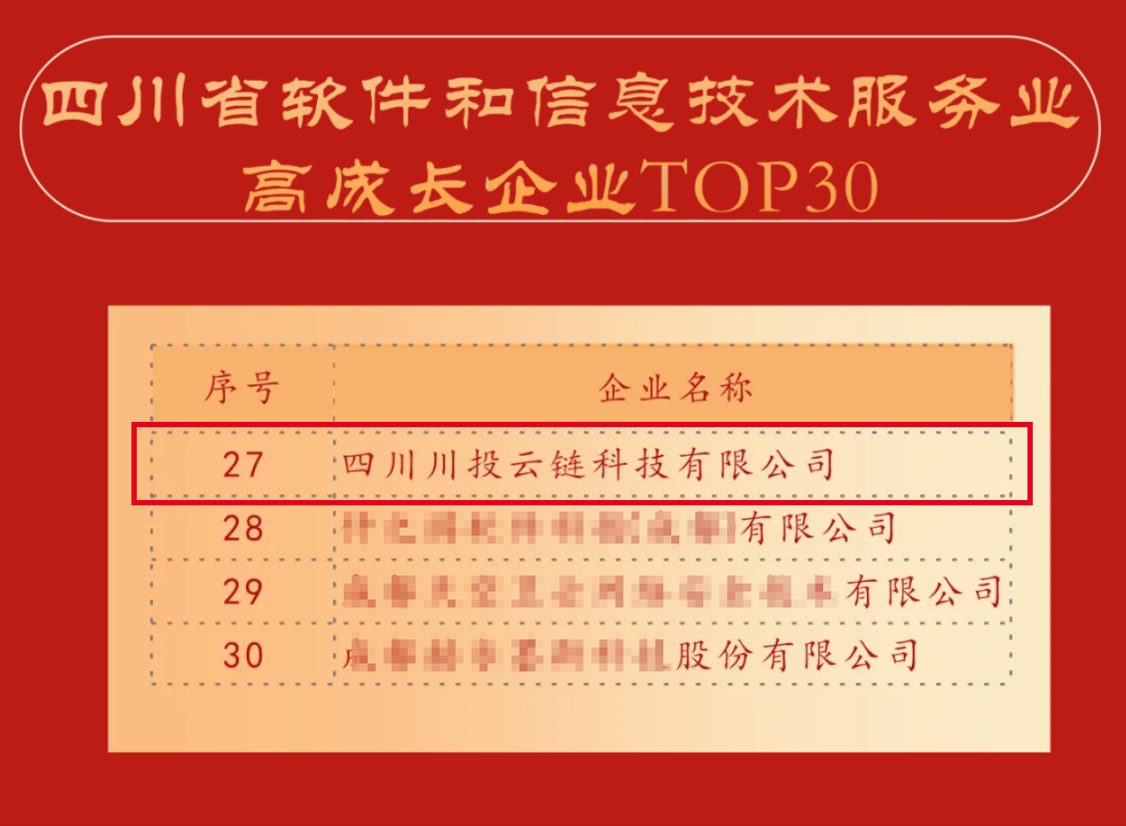【川投信產(chǎn)】再次上榜!川投云鏈連續(xù)兩年榮登四川省軟件和信息技術(shù)服務業(yè)高成長企業(yè)TOP30榜單
