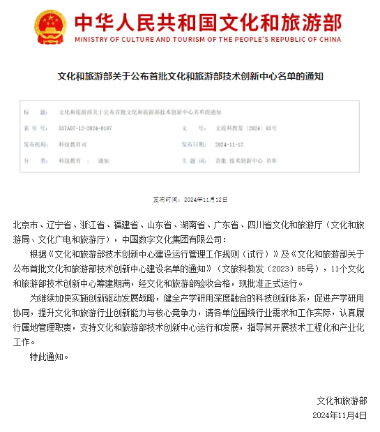 11月12日,文化和旅游部公布首批文化和旅游部技術創(chuàng)新中心名單,其中,川投信產(chǎn)所屬川投數(shù)科(全稱:四川川投智勝數(shù)字科技有限公司,原簡稱:智勝集成)“視覺融合場景體驗文化和旅游部技術創(chuàng)新中心”入選,被批準正式運行。