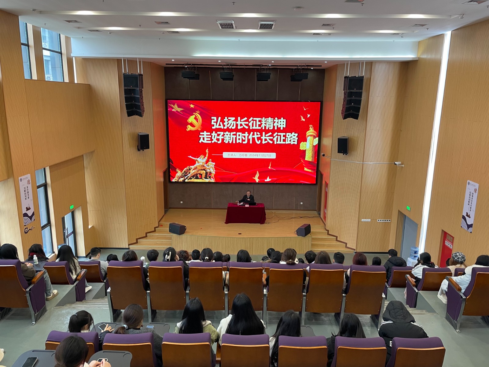 課堂上,萬呼春采取理論與實踐相結(jié)合的方式,以偉大長征精神為切入點,分享了長征途中的一系列動人故事,深入闡述長征精神的豐富內(nèi)涵和深遠意義,激發(fā)青年學生愛黨愛國愛校的熱情和發(fā)憤圖強、技能報國的決心,鼓勵大家為實現(xiàn)中華民族偉大復(fù)興的中國夢而頑強奮斗。