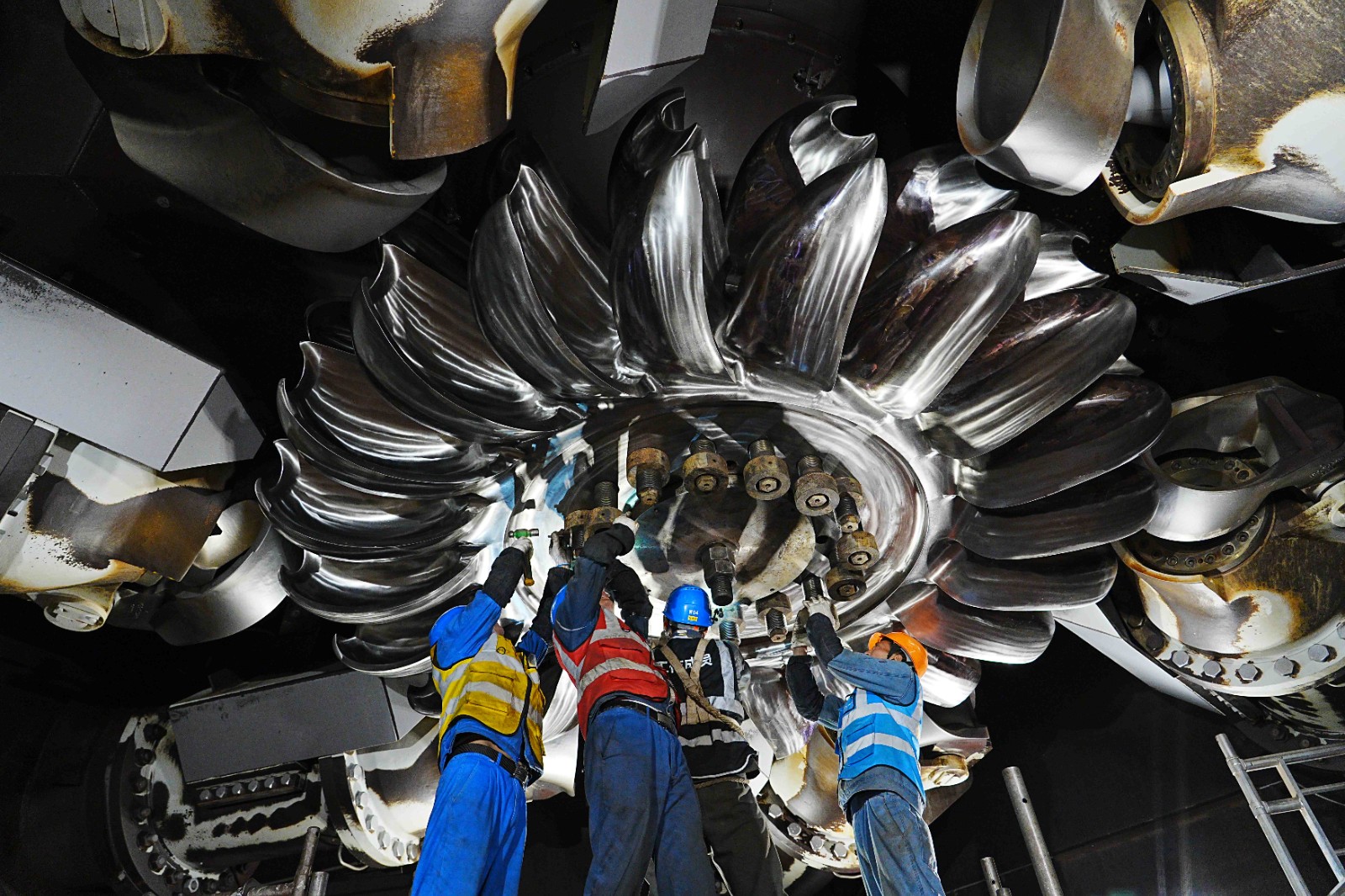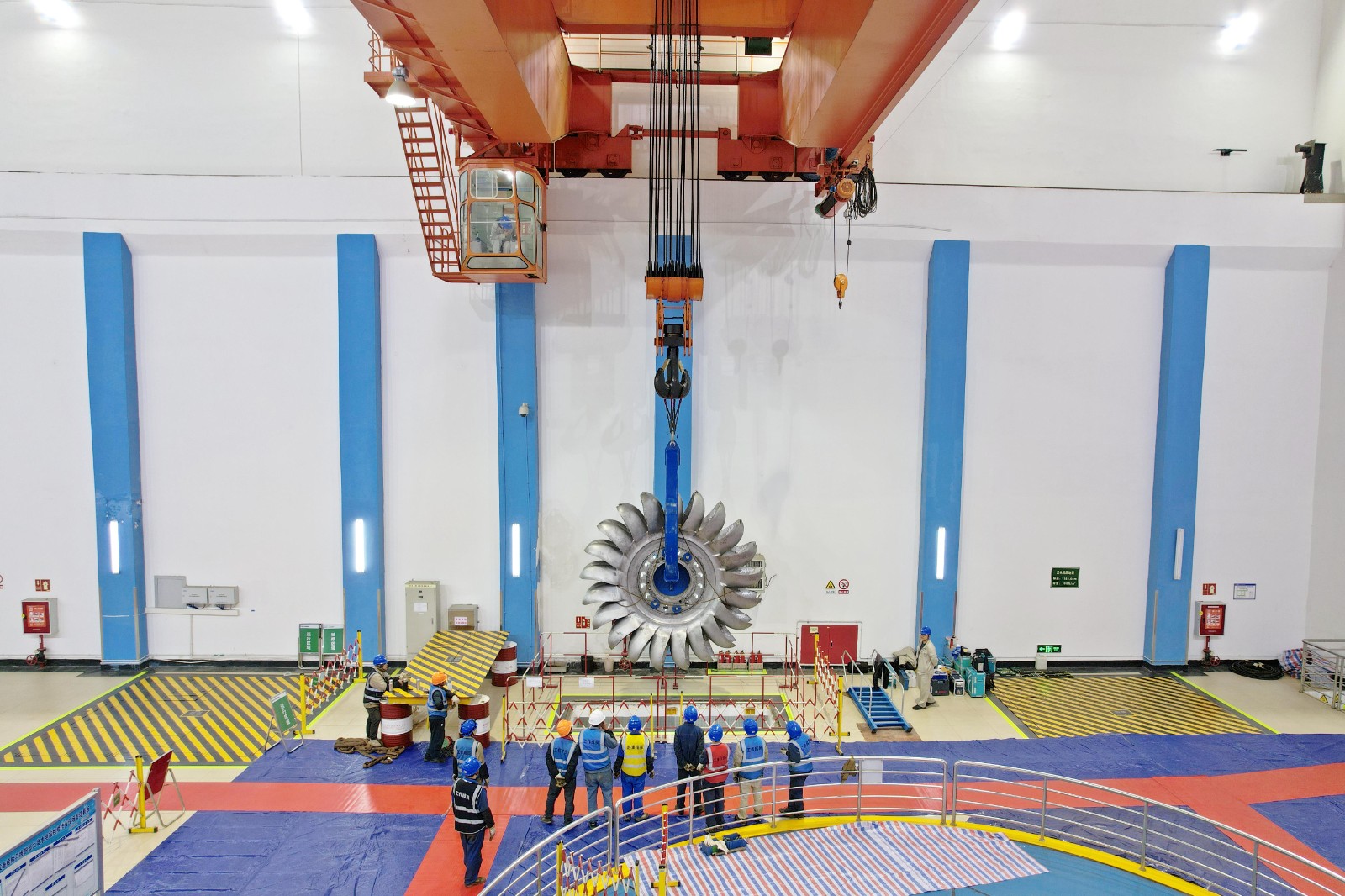 12月2日,轉輪更換作業(yè)正式開始,拆卸門板、拉伸螺栓、轉輪下放,每一項工作都有條不紊地推進。在專用工具的加持下,現(xiàn)場的轉輪翻身更成為一道亮麗的風景線。全體作業(yè)人員各司其職、緊密協(xié)作,克服環(huán)境溫度低、液壓拉伸器安裝對位難等諸多難題,經(jīng)過近8天的全力奮戰(zhàn),最終實現(xiàn)本次轉輪更換工作安全圓滿完成。