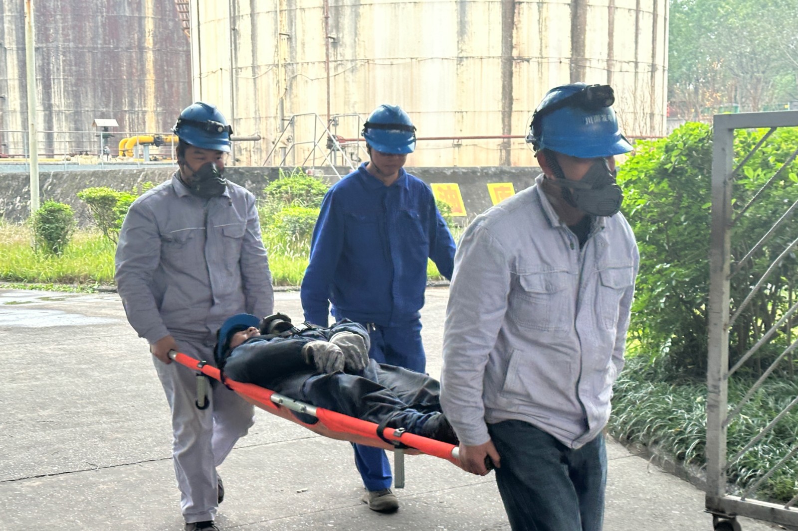 應(yīng)急演練模擬了“工作人員在公司燃油泵房地溝內(nèi)檢查燃油管道腐蝕情況時,現(xiàn)場有毒有害氣體檢測裝置突然報警,一名工作人員窒息暈倒”的危急情況?,F(xiàn)場監(jiān)護人員立即匯報運行當(dāng)班值長、隊長和部門負(fù)責(zé)人,并立即啟動應(yīng)急救援預(yù)案,組織開展救援。救援過程中,施救人員正確佩戴正壓呼吸器及救生繩等安全防護用品后實施救援,成功將傷員救出并及時轉(zhuǎn)移,演訓(xùn)達到了預(yù)期效果。