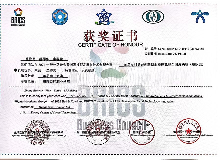近日,2024年“一帶一路”暨金磚國家技能發(fā)展與技術(shù)創(chuàng)新大賽首屆鄉(xiāng)村振興創(chuàng)新創(chuàng)業(yè)模擬競賽全國總決賽在陜西省咸陽市楊凌職業(yè)技術(shù)學(xué)院順利舉辦,資陽口腔職業(yè)學(xué)院李蕊瑩、張潤月、郝思華學(xué)生團(tuán)隊(duì)在比賽中脫穎而出,榮獲高職組全國二等獎(jiǎng)。