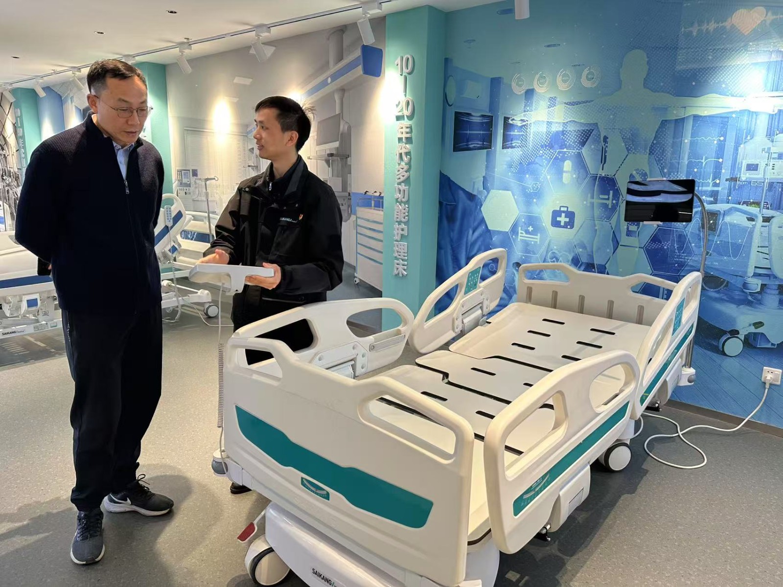 姜濤一行首先在張家港市考察了江蘇賽康醫(yī)療設備股份有限公司。賽康醫(yī)療是國內(nèi)領先的醫(yī)用病床、護理床研發(fā)生產(chǎn)企業(yè),于2016年12月掛牌新三板創(chuàng)新層。賽康醫(yī)療的管理團隊對姜濤一行的到訪表示歡迎,介紹了公司的歷史沿革、國內(nèi)醫(yī)療家具設備發(fā)展的方向,引領參觀了整體醫(yī)護設備一站式解決方案展廳。姜濤對賽康醫(yī)療的接待表示感謝,雙方就醫(yī)療設備的發(fā)展及與川投大健康產(chǎn)業(yè)集團業(yè)務合作展開座談交流。
