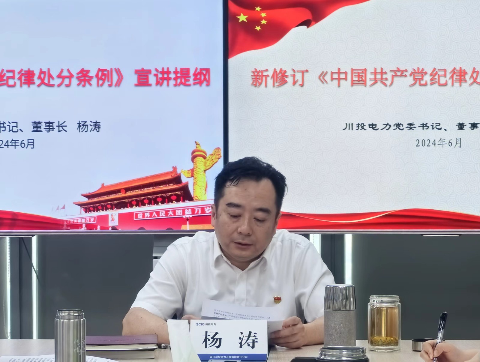 為深入貫徹落實習(xí)近平總書記關(guān)于黨的自我革命的重要思想,引導(dǎo)黨員干部職工增強紀(jì)律意識,強化思想武裝,提升黨紀(jì)學(xué)習(xí)教育成效,按照川投電力黨委關(guān)于開展黨紀(jì)學(xué)習(xí)教育的工作安排,6月24日上午,川投電力黨委書記、董事長楊濤講授黨紀(jì)學(xué)習(xí)教育紀(jì)律黨課。川投電力黨委委員、紀(jì)委書記謝麗主持會議。